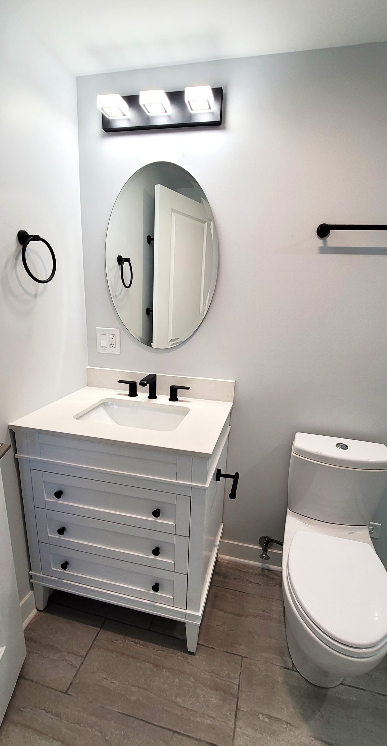 From the sleek white double vanity with matte black hardware in the primary bathroom to the elegant floating dark wood vanity with brushed gold fixtures, every element was selected to harmonize with the unique characteristics of each space.